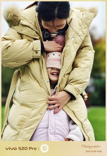 母亲和女儿在一起玩躲猫猫,女儿躲在妈妈的怀里,帽子遮住眼睛,“妈妈猜猜我在哪里呢?”,“永远在妈妈的呵护里”,这个画面好温馨!