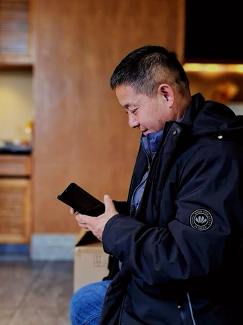 某餐厅包房,开餐前,这位跑前跑后、跑上跑下不辞辛苦的老者,得空翻阅手机,聚精会神之下,略显苍桑的脸庞上,露出了会意的微笑。