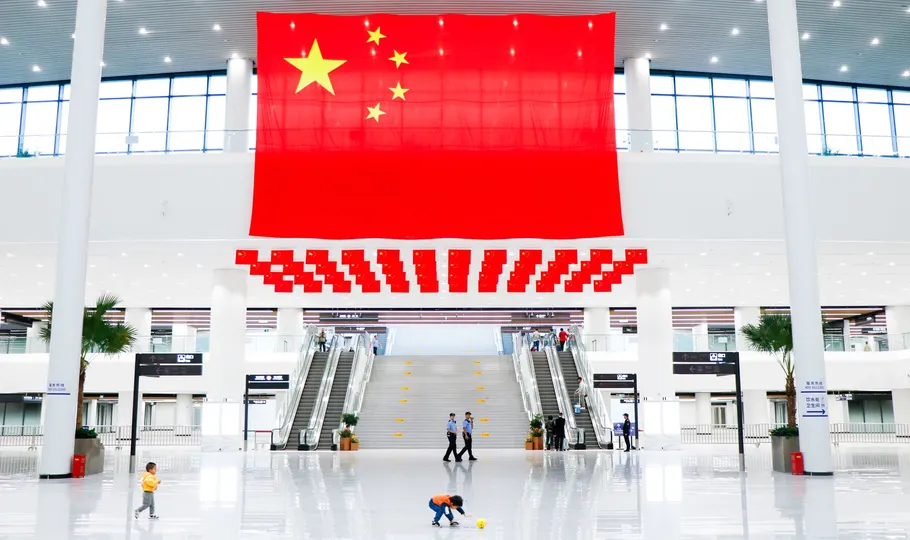十一期间的北京丰台站,大厅中挂起了五星红旗,旅客带着小朋友在玩耍等候列车,红旗下面有警察巡逻
