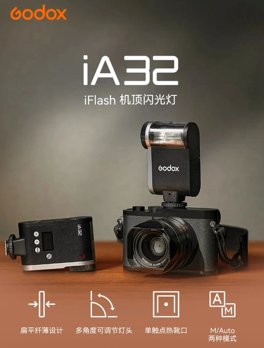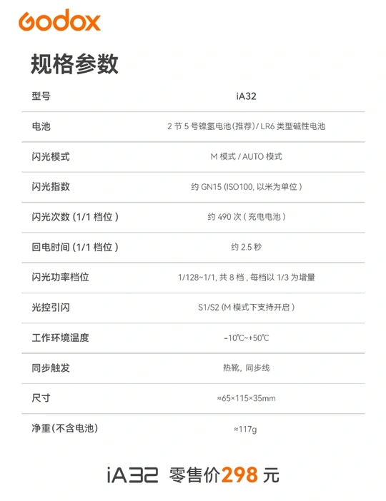 这是一款一体式扁平化的机顶闪光灯,采用单触点设计,可以兼容大多数相机型号。GN指数约为15,通过两节5号电池供电,全功率下回电时间约为2.5秒,闪光次数约为490次。用户可设置自动和手动模式,在手动模式下,具备8档功率(1/128~1/1)可供选择。机身可通过侧面旋钮调整灯管角度控制光线方向,可轻松实现跳闪,较为适合创意拍摄。iA32机顶闪光灯尺寸约为65x115x35mm,重量约为117g,整体比较小巧。目前,该闪光灯定价为298元,编辑认为该灯比较适用于入门用户以及追求轻便出行的摄影爱好者。