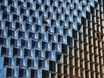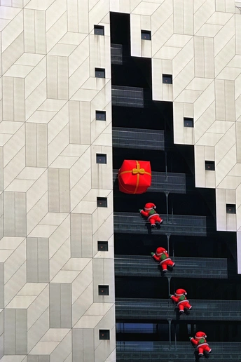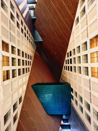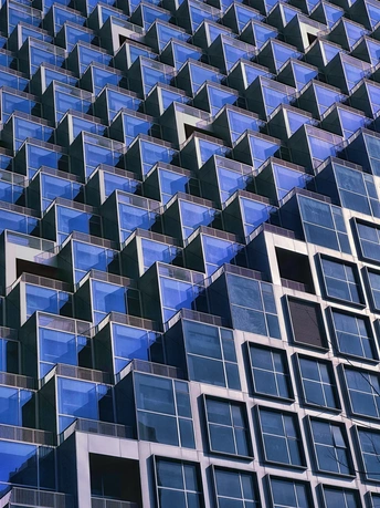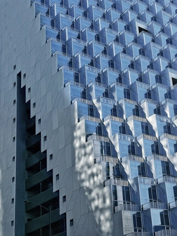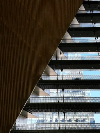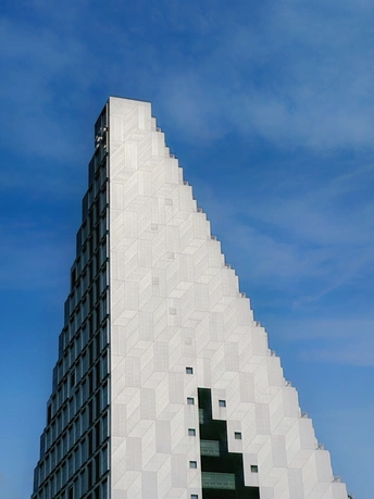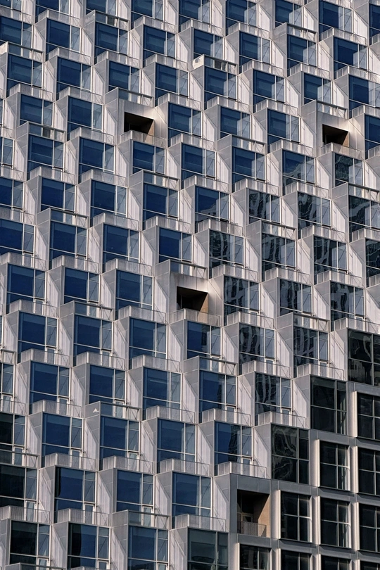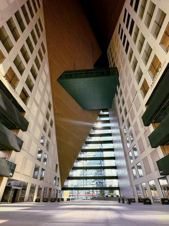 杭州光棱,未来新湖中心。建筑幕墙为大面积的玻璃,锋利的倾斜切割定义了棱镜的形状,建筑外表上一系列几何形状凸起是光棱,不仅赋予建筑独特的视觉效果,而且还可以发射和扭曲光线,随着角度或日照的变化会带出现不同的光线效果。整个建筑如同一座指向云端的山峰,外面看起来有点象金字塔,里面有个巨型中庭。