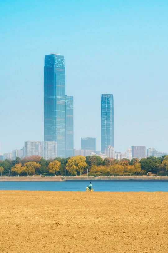 拍摄于湘江冬季的江滩上,江水褪去,人们或散步或骑行于江滩之上。