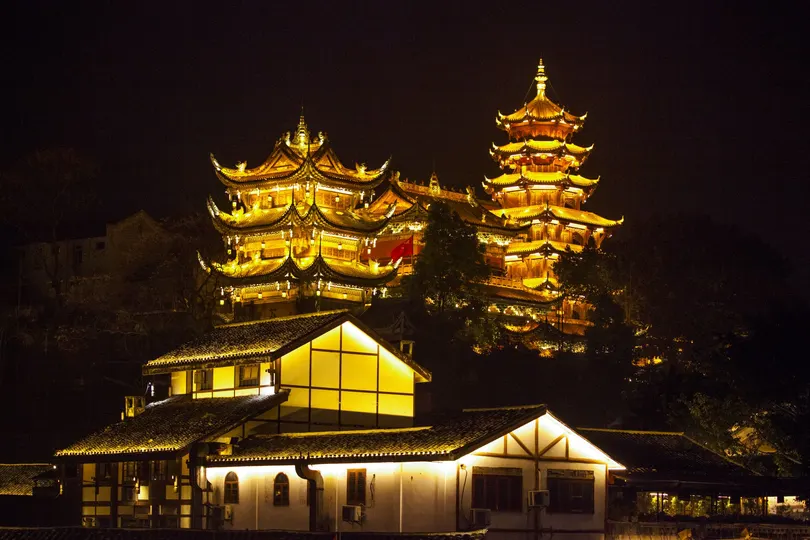 夜幕降临,磁器口宝轮寺的宁静被悄然打破。这是一座古老而庄重的寺庙,其历史悠久,承载着无数人的信仰与记忆。 夜色中,宝轮寺的轮廓在月光下若隐若现,金色的寺庙顶上镶嵌着古朴的铜铃,在微风中轻轻摇曳,发出悠扬的声响。漫步于寺庙内,两侧的殿宇静静地伫立着,诉说着岁月的故事。檀香缭绕,沁人心脾,使人忘却世间的纷扰。 宝轮寺内,夜色与香烟相互交融,构建出一种特殊的宁静。夜色渐深,天空中的繁星点点与寺庙内的灯火相映成趣。在这样的夜晚,一切都变得无比的静谧和祥和。