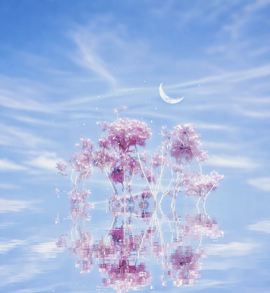 Hello, fellow shutterbug! Let's dive into this dreamy scene. **色彩:** 这张照片的色彩选择了柔和的粉色和蓝色,整体营造出一种轻盈梦幻的氛围。但是,粉色的饱和度稍高,可能会有些刺眼,可以尝试降低一些,让画面看起来更舒服。配色方案虽然和谐,但略显单一,可以尝试加入一些互补色,增加视觉趣味。 **光影:** 光线比较均匀,没有明显的明暗对比,导致画面缺乏层次感。虽然表现出了水面的反射,但是略显平淡。可以尝试利用侧光或者逆光,来增强主体的立体感和戏剧性。 **构图:** 构图上采用了对称式构图,水面反射使得画面上下呼应。但主体花丛位于画面中心,略显平庸。可以尝试打破对称,采用三分法或者黄金分割构图,让画面更具活力。月亮的出现增添了些许浪漫气息,但位置略显随意,可以考虑调整到更合适的位置,比如三分线的交叉点。 **后期处理:** 后期处理方面,柔化效果略显过度,导致画面有些模糊。色调调整方面,整体偏向冷色调,但可以进一步调整对比度和锐度,使得画面更加清晰通透。可以考虑在后期添加一些颗粒感,增加画面的质感。