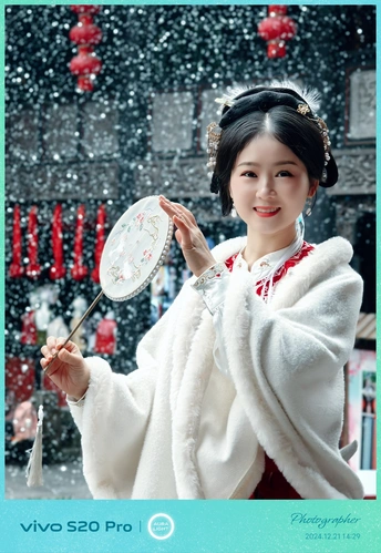 冬天的雪景加上年味,更有氛围感,背景的灯笼 和红飘带,和雪天里的小姐姐相得益彰,更增添 了节日的氛围。