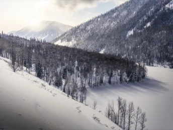 喀纳斯,干枯萧瑟的森林和白雪皑皑的雪原形成鲜明的对比。光和树合作,一同在雪地里投下长长的影子。