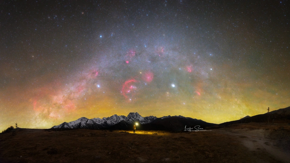 24年的年底。我跟朋友来到了香格里拉,在去往德钦的路上,途径老214国道,看到了白马雪山,相比梅里雪山,这里更加安静,几乎没有光污染。于是在雪山下拍下了冬季银河,雪山的合影。 📷:索尼A7R天文改机➕适马1424➕Lee2号柔焦 单张90s曝光,合成全景图。
