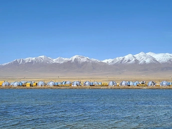 青海湖畔,天空湛蓝,空气通透,远山带雪,帐篷连绵,如诗如画。