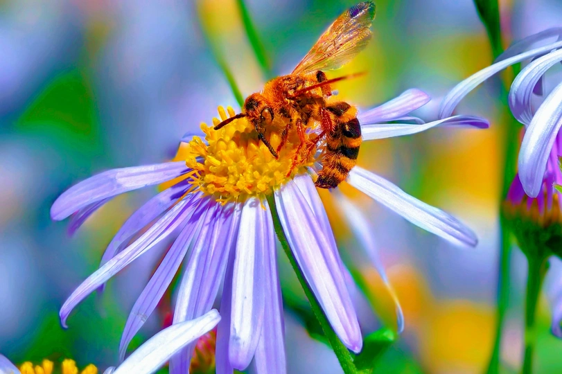 在五彩斑斓的花丛中,一只蜜蜂正忙碌地停驻在一朵紫色的小花上,它那橙黑相间的身躯与花朵的柔美色彩相映成趣。这一刻,仿佛时间都为这勤劳的小生灵而驻足,见证着它与花儿间那无声的默契与美好,尽显大自然的灵动与生机。