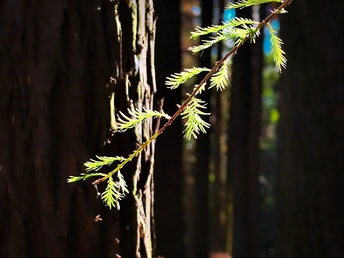 用光影描绘新生,嫩芽的翠绿与背景树木的深棕和谐对比,侧逆光很好的突出了嫩芽的轮廓,枝条斜向贯穿构图,透过光影和角度,呈现新生和力量,传达了积极向上的生命力,引发对于希望的思考。