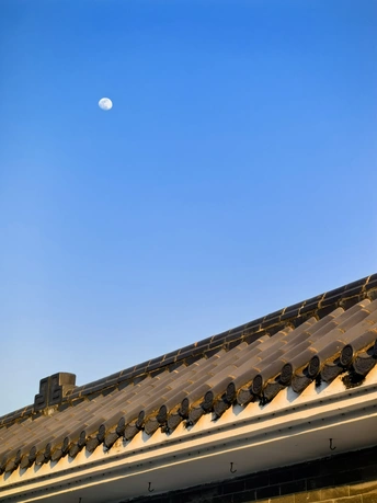 傍晚的月亮,如同一面被巧妙打磨的银镜,静静地悬挂在天际。它的大小适中,仿佛是上天特地为人间量身定做的,让人感到无尽的柔和与亲切。