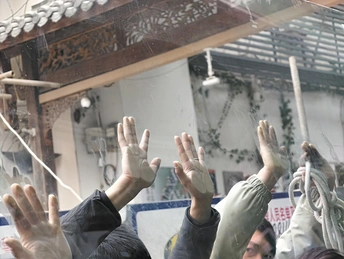 几个人正在搬运玻璃。