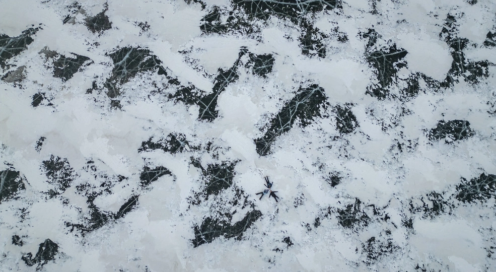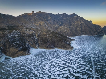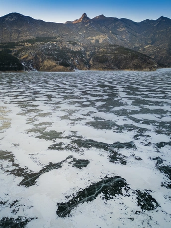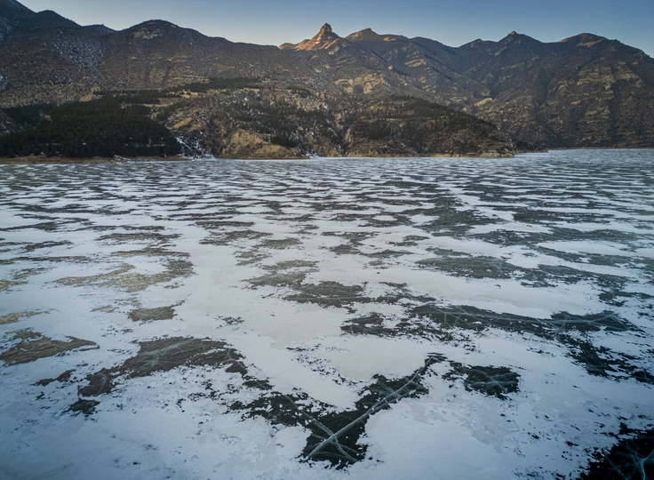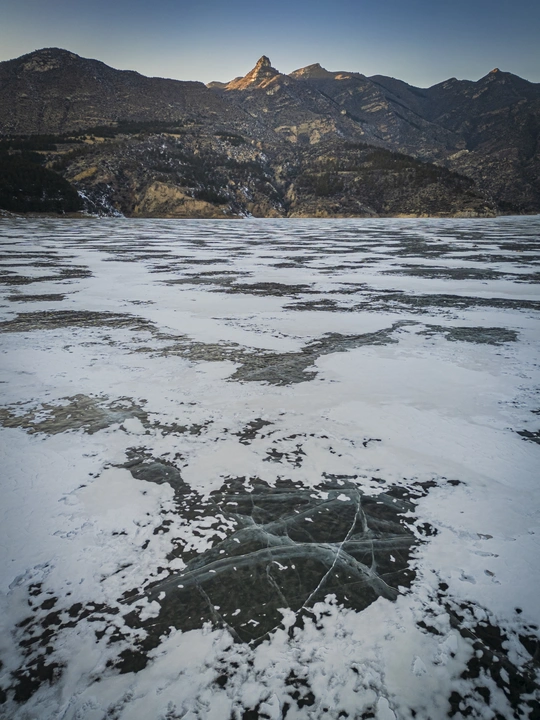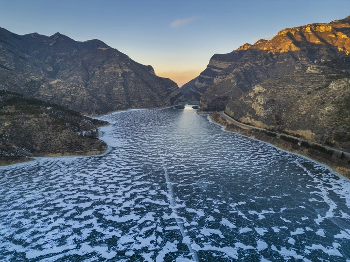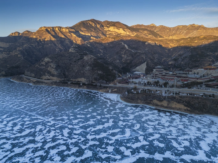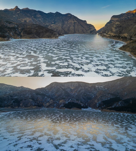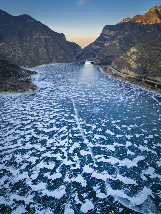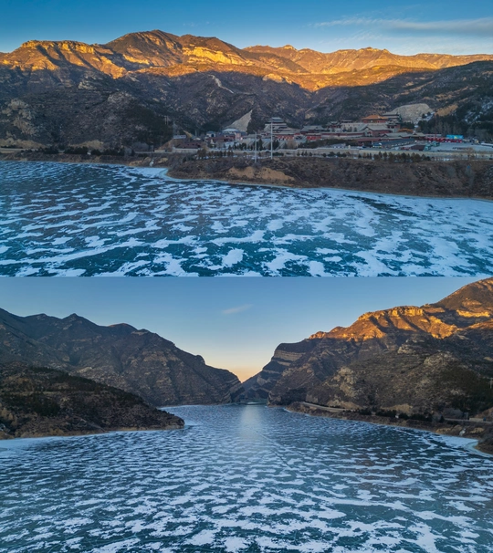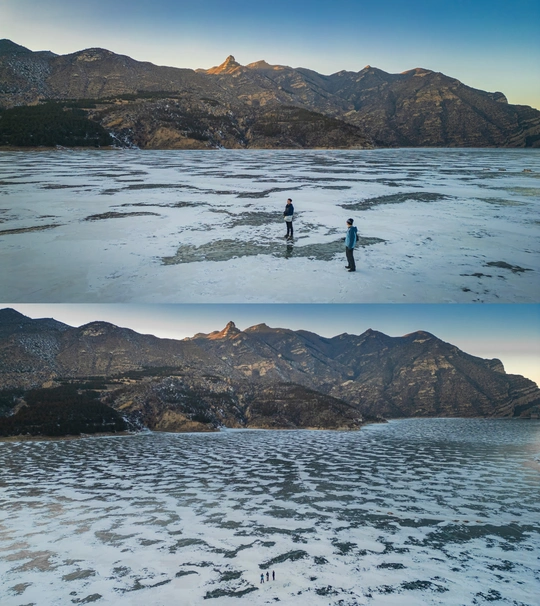 昨天爬完北岳恒山,踏冰打卡起点的这个冰湖,航拍时被惊艳到了!低飞是黑冰,高飞就是蓝冰!