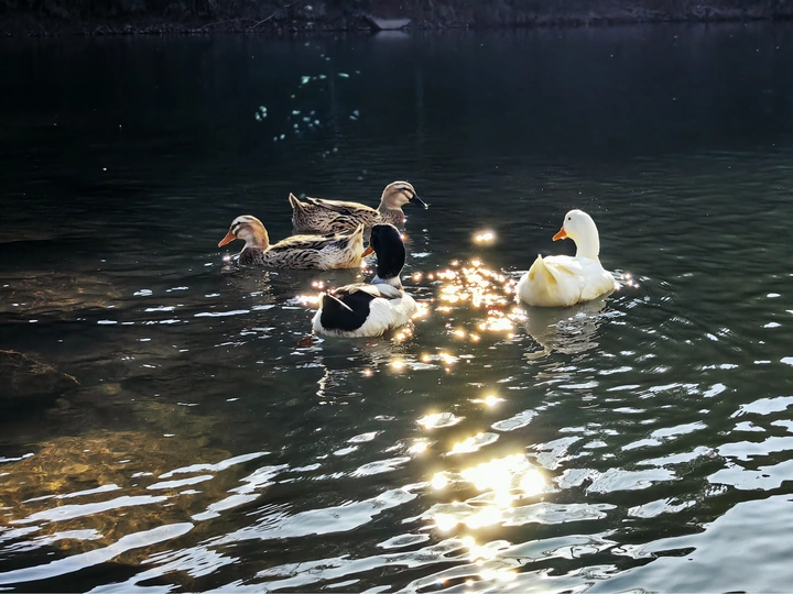 冬日暖阳下,河面上一群鸭子欢快的嬉戏。