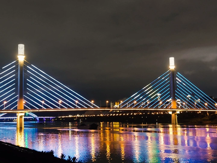 南宁五象大桥夜景照片,桥梁的霓虹灯光倒映在邕江水面上,反射出一片绚烂。