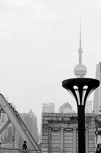 摄于上海外滩源。选择这一视角,利用路灯和东方明珠电视塔空间距离的叠加,形成错位景象。路灯的暗黑厚实,浦东建筑的浅灰朦胧,呈明暗对比和虚实对比。