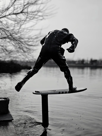 水翼板运动,一项结合了速度、技巧与自然之美的水上运动,以一种近乎飞翔的姿态,在碧波之上自由穿梭。这项运动不仅考验着运动员的平衡感、力量与勇气,更是对大自然的一次深情拥抱,让人在挑战与享受中,与自然和谐共生。 晨曦初破,海面被第一缕阳光染上金色,一位身着紧身潜水服的运动员,正站在一块特制的水翼板上,准备开始他的探险。 在空中与水面的交界处,运动员仿佛进入了一个全新的世界。他需要根据河面的变化,不断调整身体的重心和姿势,时而俯身降低风阻,时而侧身划过浪尖,每一个动作都要求对水流有着精准的感知和判断。风,从耳边呼啸而过,带着河水的清香,让人心旷神怡;浪花,在身边跳跃,如同欢快的精灵,为这趟旅程增添了几分野趣。 随着夕阳西下,河面上洒满了金色的余晖,运动员缓缓减速,最终平稳地回到了出发点。虽然身体略显疲惫,但脸上洋溢的却是满足与喜悦的笑容。水翼板运动,不仅仅是一场身体上的锻炼,更是一次心灵的洗礼,让人在速度与激情中找到了与大自然和谐共处的方式,体会到了前所未有的自由与释放。 这就是水翼板运动,一项融合了科技、自然与人体潜能的极致运动。