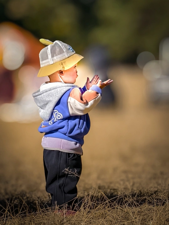 在公园的草地上,一个小男孩从地上爬起来,看着自己脏脏的小手,嘟嘴的样子呆萌可爱。