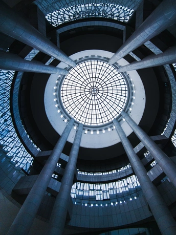 步入福州工人文化宫,首先映入眼帘的是那恢宏壮丽的建筑风貌。正如图片中所展示的,那极具特色的穹顶设计,仿佛是时光雕琢的艺术品。巨大的圆形玻璃穹顶,宛如苍穹之眼,透过细密的格栅,洒下柔和而圣洁的光芒,照亮了整个大厅。穹顶之下,粗壮的石柱巍然耸立,它们如同历史的守护者,默默支撑着这座文化殿堂的宏伟与庄重。石柱与穹顶的巧妙搭配,展现出一种刚柔并济的美感,既有力量的象征,又不乏细腻的艺术情怀。 四周环绕的玻璃幕墙,如同一面面灵动的镜子,将室外的光影与室内的景致相互交织,营造出一种如梦如幻的空间氛围。阳光透过玻璃,在地面上投射出斑驳的光影,随着时间的推移,光影变幻,仿佛在诉说着文化宫的日升月落、四季更替。