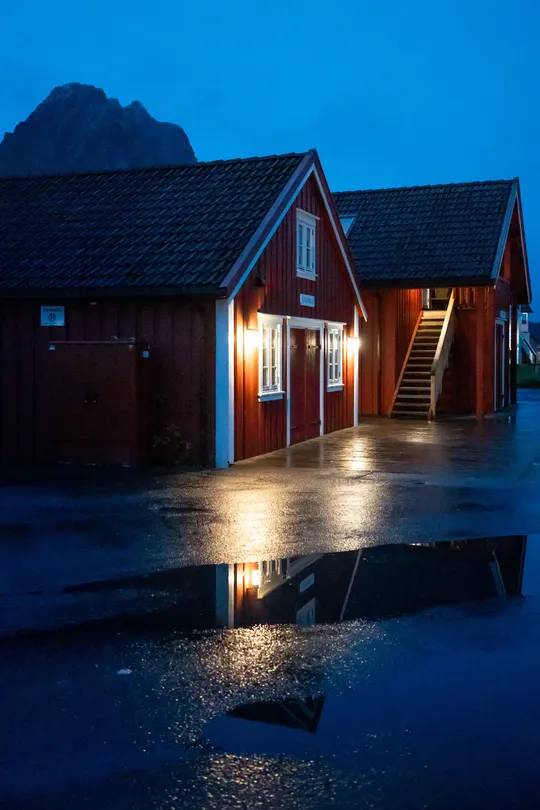 蓝调时刻的红房子开着黄色的灯,萧瑟中的温暖气息。