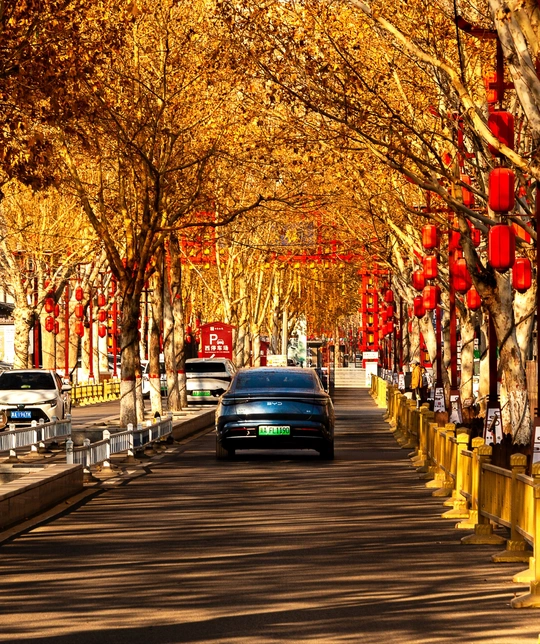 一个秋意浓浓的午后,温暖的阳光透过金黄的树叶,洒在宽阔的街道上,形成一片片斑驳的光影。街道两旁整齐排列的树木,叶子已经变成醉人的金黄,仿佛在诉说着秋日的丰收与喜悦。红灯笼沿着街道高高挂起,给这个宁静的秋日增添了一抹喜庆的色彩。一辆电动汽车缓缓行驶在路上,仿佛在享受这独属于秋天的静谧与美好。路上行人稀少,偶尔有人驻足,欣赏这如画的街景,沉浸在这温暖而惬意的时光里。
