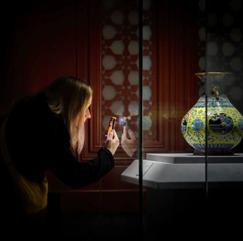在北京故宫博物院的瓷器馆中,一位外国女游客借助着手机光亮,仔细观赏着珍贵的中国瓷器。 @米拍编少