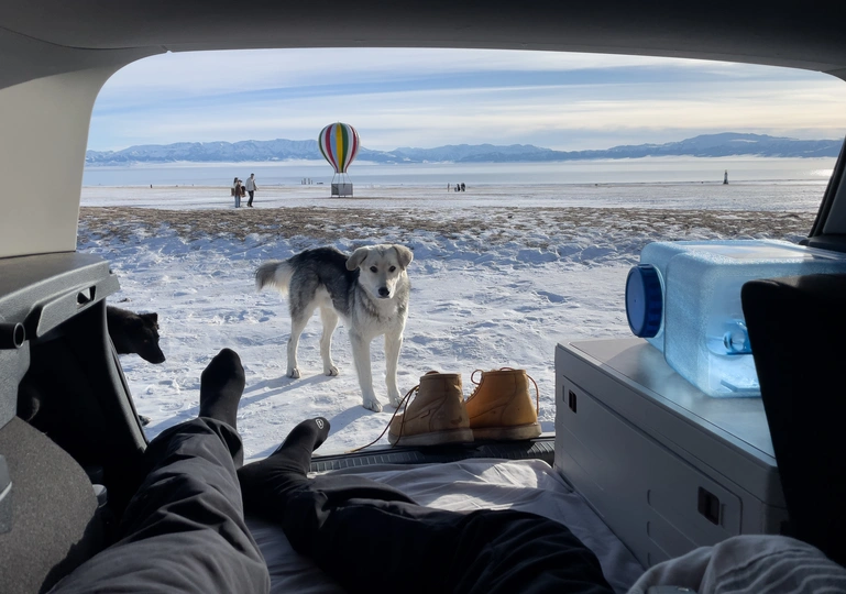 床车(日常睡车里)旅行到赛里木湖,看到好看的风景在不打扰他人的前提下打开后备箱躺下独自欣赏。好巧不巧,流浪狗进入我的"框架构图",我和它当即对视。