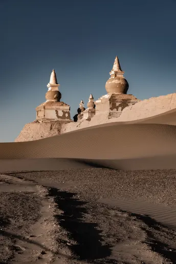 在内蒙古额济纳旗的沙漠中,一座西夏时代的古城遗址至今在黄沙中半隐半现,其中大多数建筑已经被沙漠吞噬,但四周围墙依旧在沙漠中横亘,在围墙的其中一个角落中,几座佛塔巍然矗立,展示着西夏王朝曾经的辉煌,站在沙漠中远远望去,这座古城遗址给人一种迷失的宝藏之城的感觉。