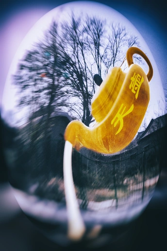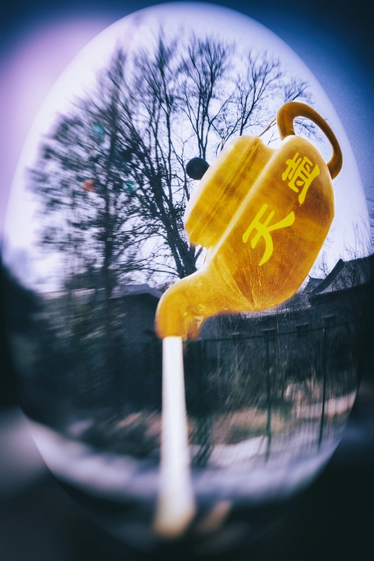 茶壶下方,水流如丝般倾泻而下,给人一种源源不断、永不干涸的感觉。玻璃球之外,是一棵光秃秃的树,树枝纵横交错,虽没有绿叶的点缀,却有着一种沧桑的美感。背景中隐隐约约的建筑,带着几分古朴与宁静。