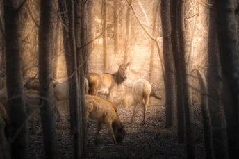 第一次拍摄野生动物,在冬天盐城野鹿荡周边的树林里,偶遇了一群正在觅食的麋鹿,晨光中恰好有一只回头看到了我