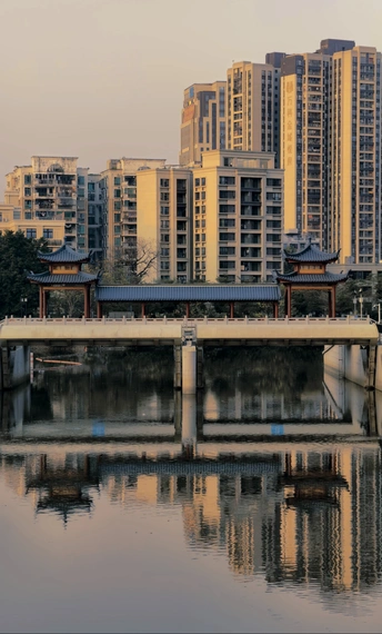 夕阳下,古桥横跨水面,亭台楼阁飞檐翘角,尽显古韵悠长。桥的那头,是鳞次栉比的现代高楼,在余晖中闪耀着金色光芒。水面如镜,倒映着这古今交融的美景,仿佛一幅静谧的画卷,诉说着城市的变迁与传承,时光在此刻交汇,韵味无穷。🌇🏯🏢