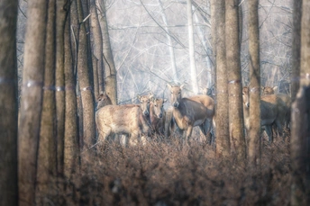 冬天晨雾中的森林,一群麋鹿仿佛林中精灵般穿梭,恰好有3只发现了我,警觉的观察着我这个外来人