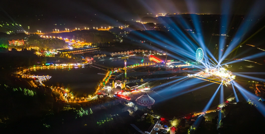 2024年2月15日,四川省资阳市安岳县宝森柠檬旅游区在春节期间举办大型游乐活动,夜晚五光十色,乡村成了欢乐的海洋。