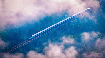 2024年12月11日,四川省资阳市城东新区晨雾缭绕,一辆列车飞驰在“云端”。