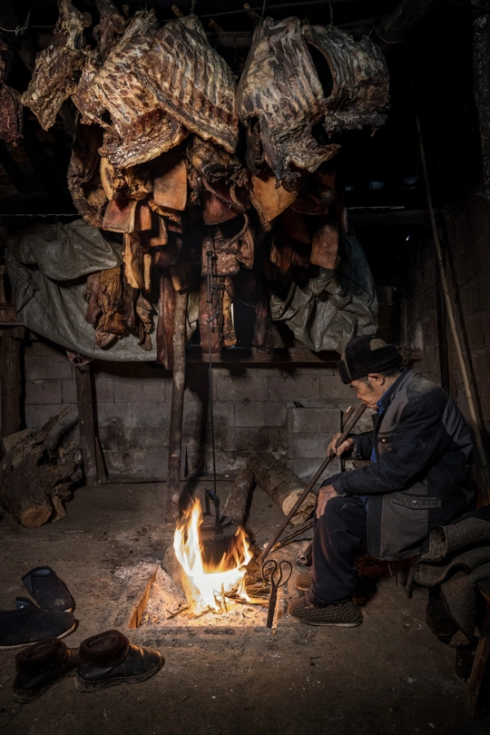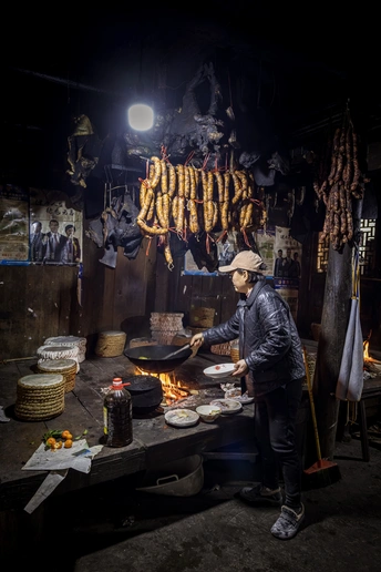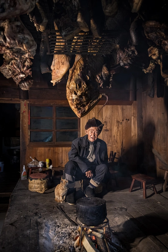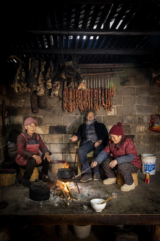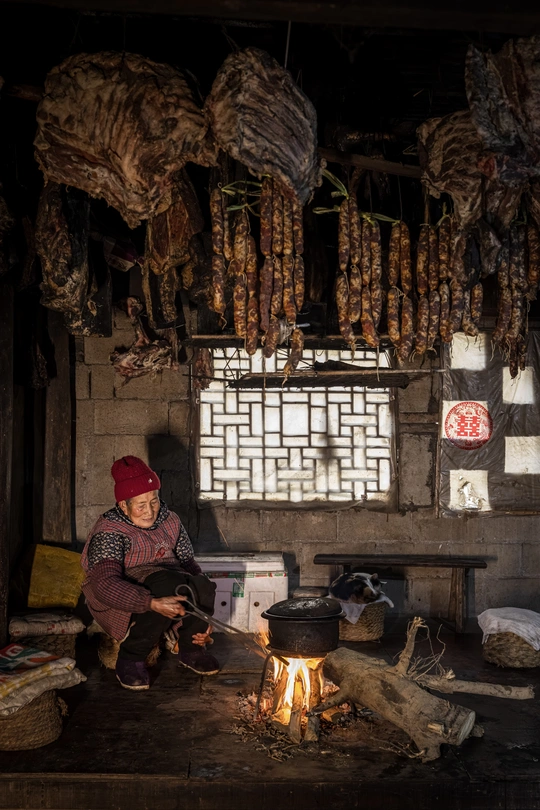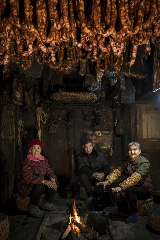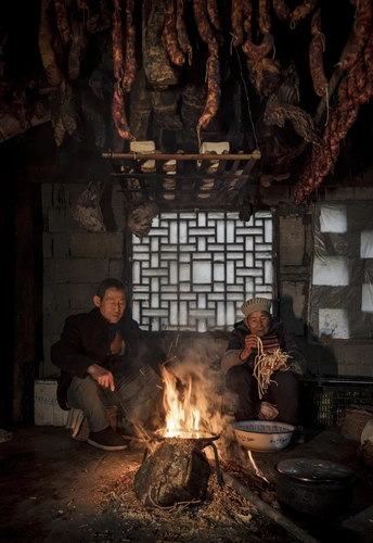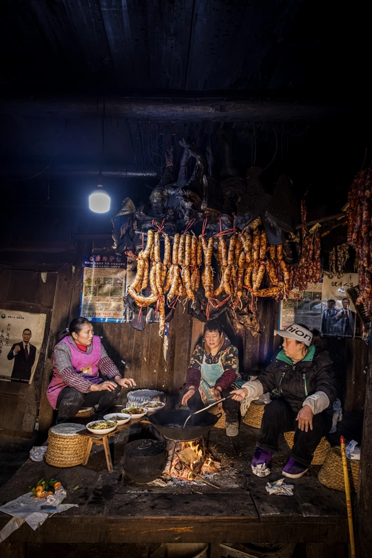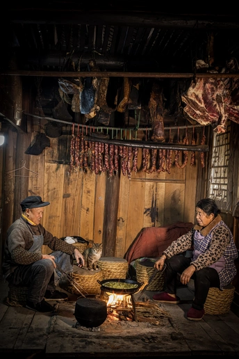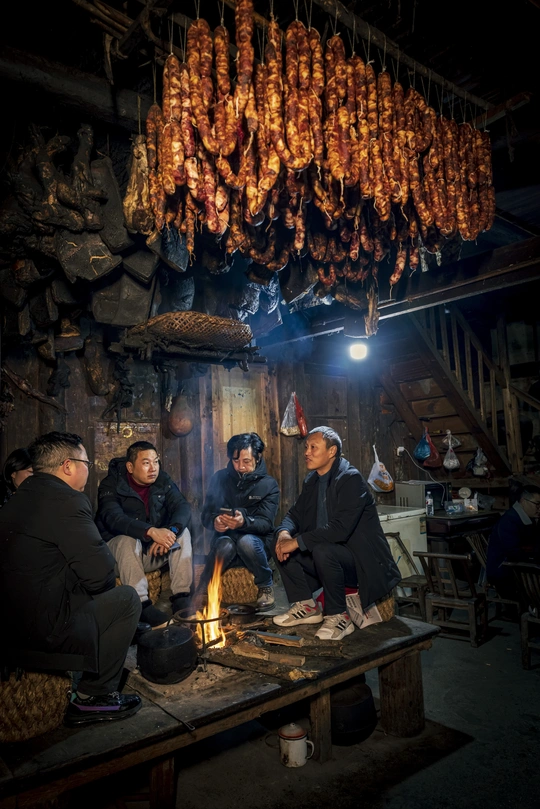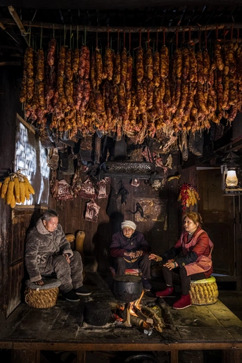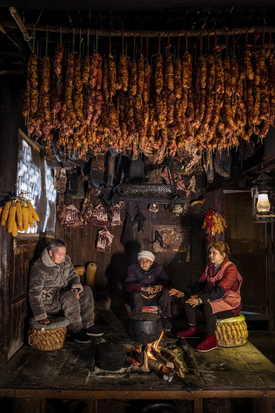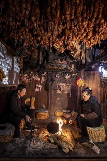 重庆彭水县鞍子苗寨,春节来临,家家户户杀年猪做香肠腊肉,欢天喜地迎新春,苗家火塘是一家人的中心,这里可以做饭,熏香肠腊肉,也是一家人围坐相聚的地方,在这里摆龙门阵特别有温度,更显一家人的其乐融融。