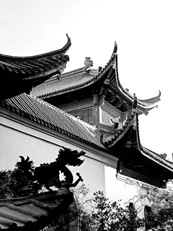 摄于上海佛教居士林。古风建筑,飞檐上翘;晨光初照,黑白影调。选择这个视角,记录此刻此景。