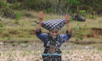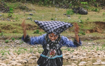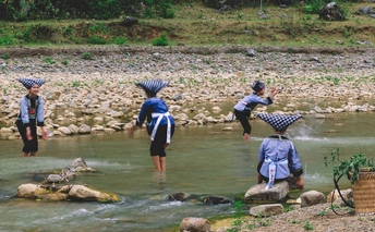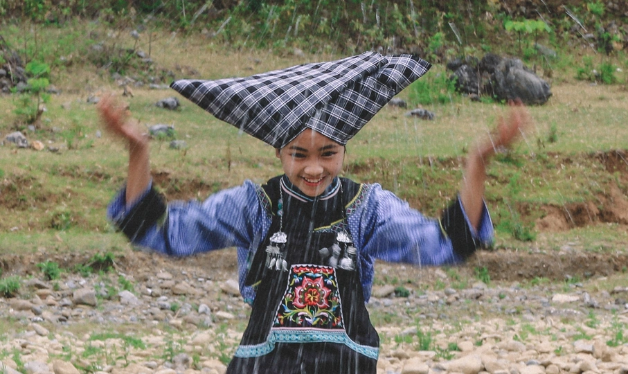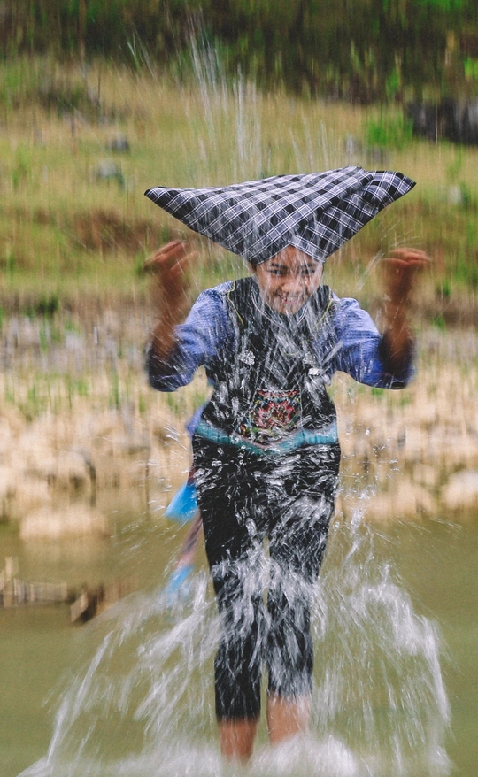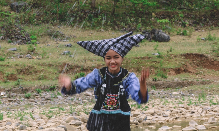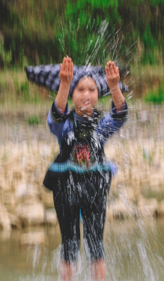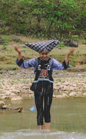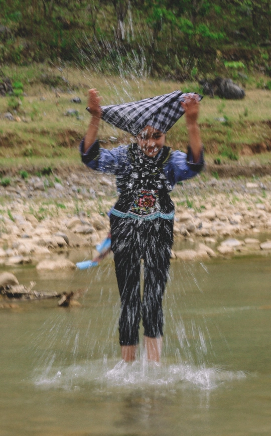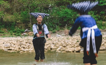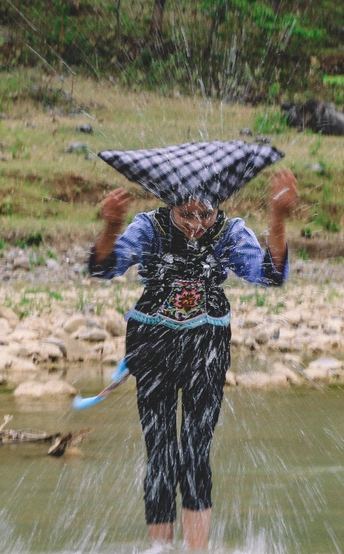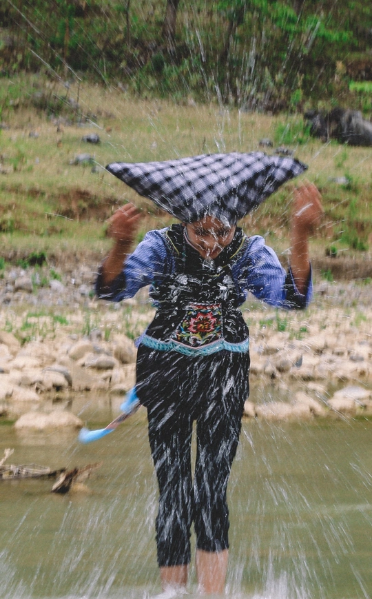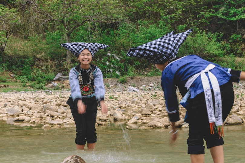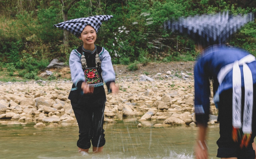 2000年1月1日,贵州省黔西南布依族苗族自治州望谟县边饶镇播东村,布依族女孩在河边戏水。
