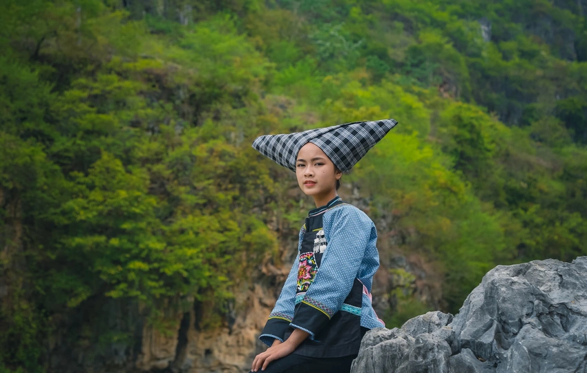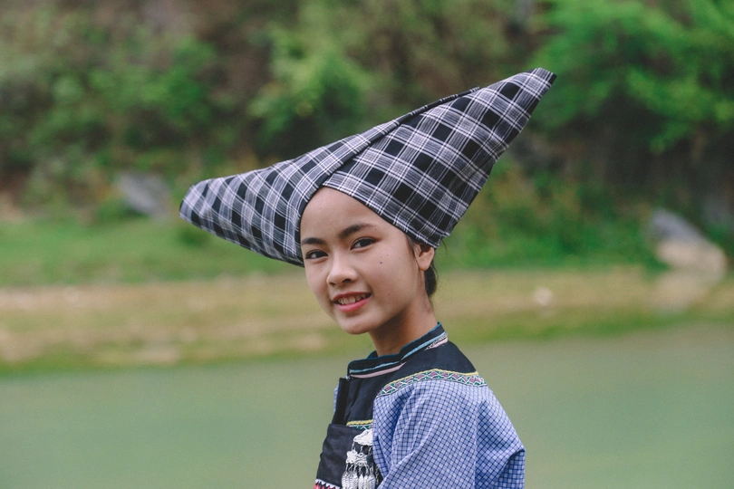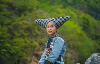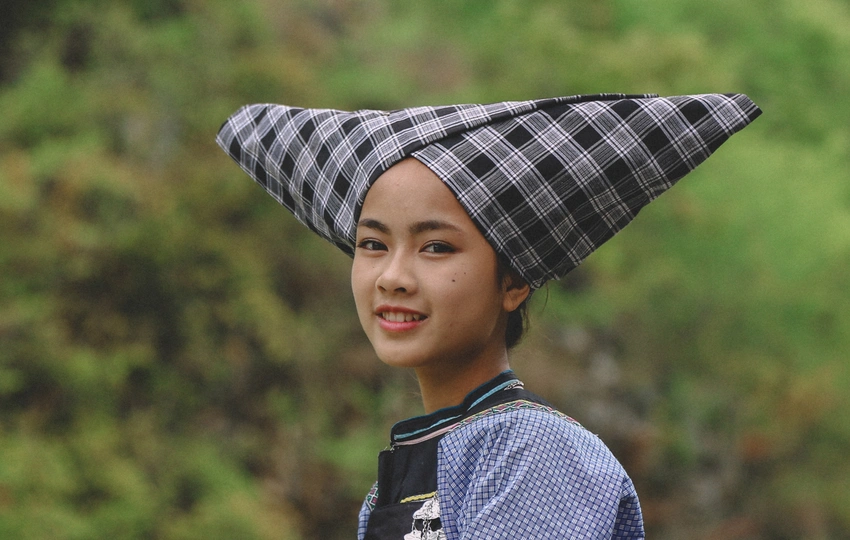 2000年1月1日,贵州省黔西南布依族苗族自治州望谟县边饶镇播东村,一名身着传统西北角牛角布依传统服饰的布依族少女。 在坎边一带的布依族少女保留了用一丈多的自制花格布头帕包牛角状头饰的习俗。