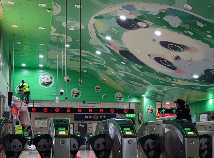 2025年1月6日,重庆市九龙坡区轨道交通2号线重庆动物站,工人正在用大熊猫画像装饰站内大厅。 重庆动物园目前饲养展出23只大熊猫,是全球大熊猫数量最多的城市动物园之一。2004年“五一”假期前三天,重庆动物园接待游客近30万人次,单日入园游客量最高达12万人次,创下了景区历史新高。 为迎接蛇年新春佳节的到来,营造良好的大熊猫文化艺术氛围,该轨道交通站内外都画有姿态各一、憨态可掬的大熊猫形象,极大提高重庆动物园网红大熊猫的辩识度。