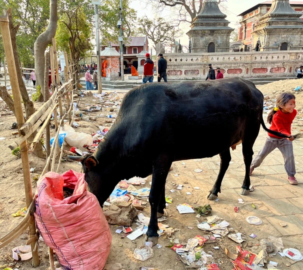 2024年03月拍摄(抓拍)于:尼泊尔世界文化遗产——帕斯帕提那神庙。 创作背景:我当时正在世界文化遗产——帕斯帕提那神庙拍一头正在吃垃圾的母牛,一位小女孩突然闯进了我的相机镜头,高兴的拽着母牛的尾巴,持续时间大约2秒钟,被拽尾巴的牛牛依然淡定的吃着垃圾。 情绪稳定的乖乖的牛牛与活泼可爱的俏皮的小女孩形成了巨大的反差,这一有趣且温馨的瞬间被我用相机抓拍,定格在了照片画面里。