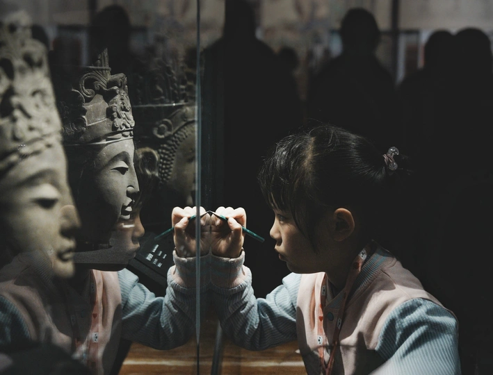 在成都博物馆偶然间拍下的小女孩临摹瞬间。 佛像不许,只是静静与之对视
