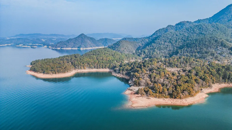 冬日暖阳中的千岛湖 碧波如镜 放佛置身温暖的避世海岛