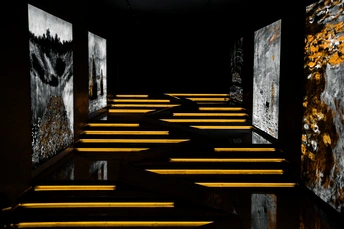 踏入这光影交织的空间,仿佛进入异度世界。地面的光带如流动星河,两侧画面似在诉说神秘过往。黑暗中,光与影共舞,模糊了现实与虚幻边界。每一步都是探秘,每一眼都是震撼,思绪随光影飘荡,沉醉于这独特的艺术之境。