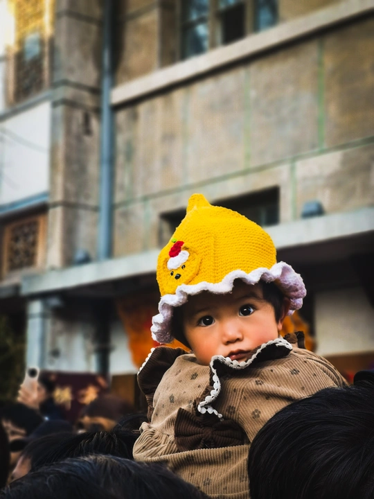 春节人山人海,一位父亲肩扛黄帽小女孩,她那双清澈的眼神,被我用相机拍摄!