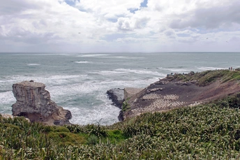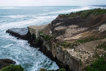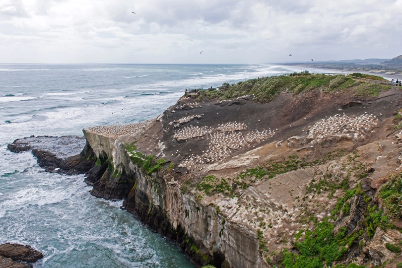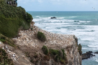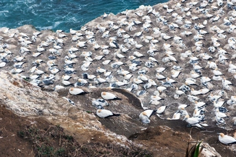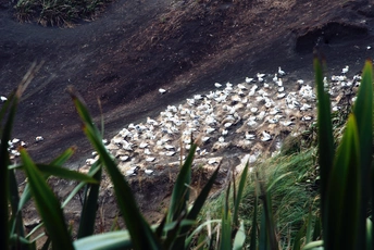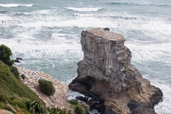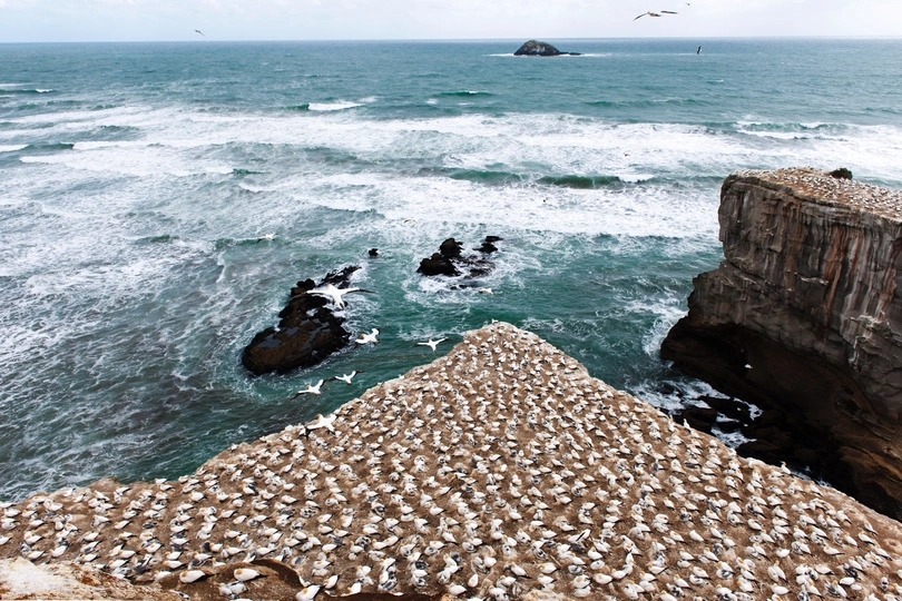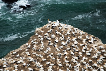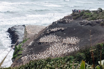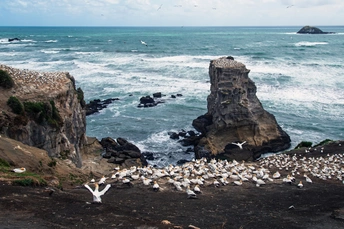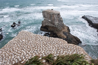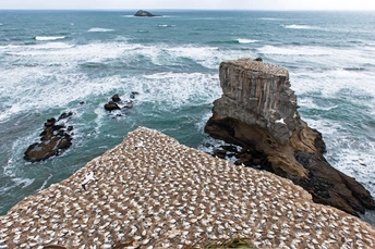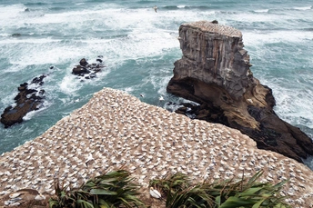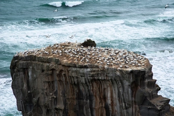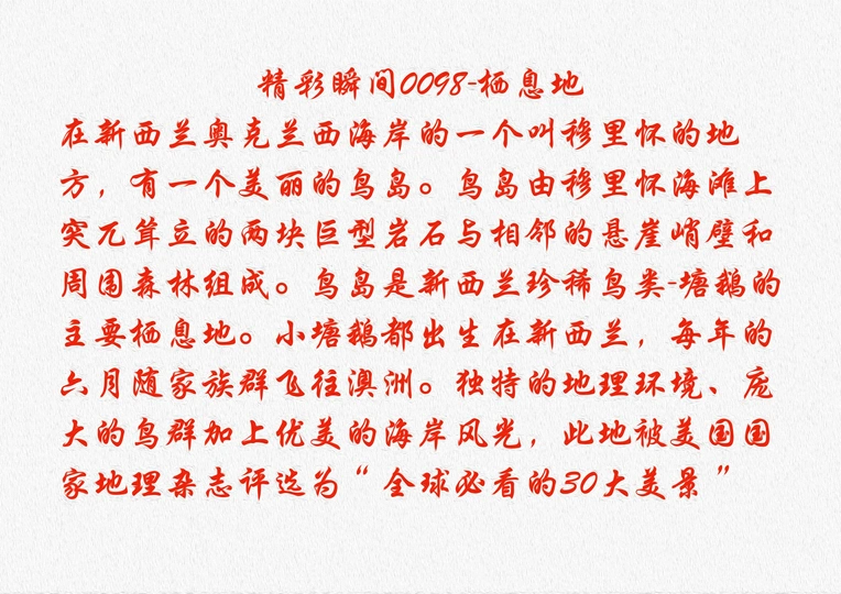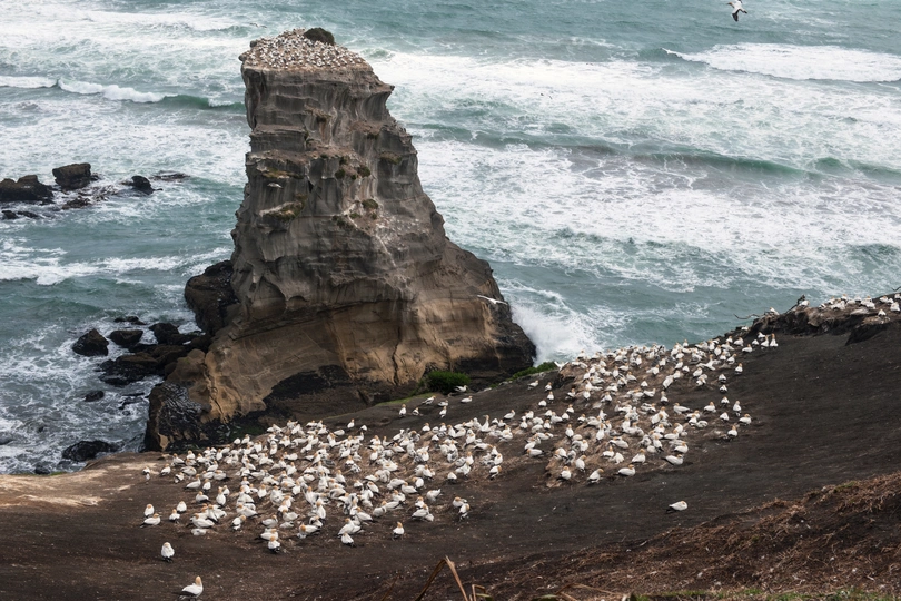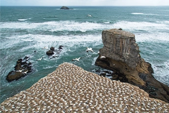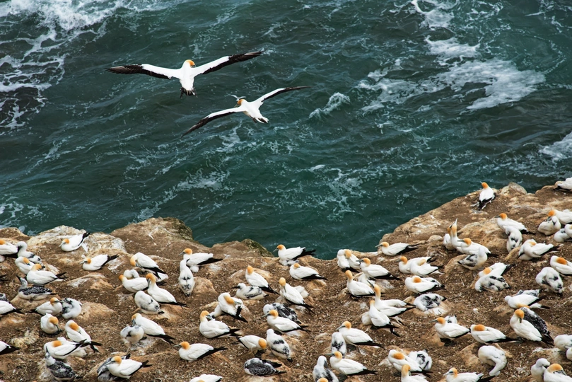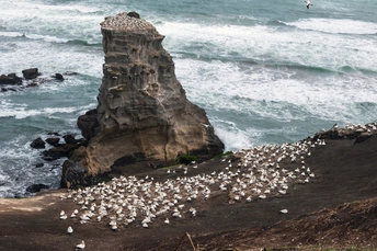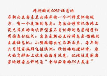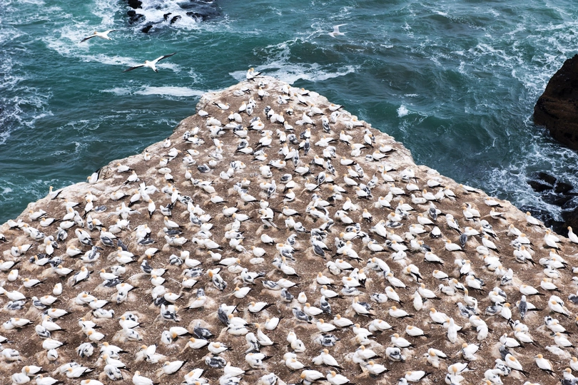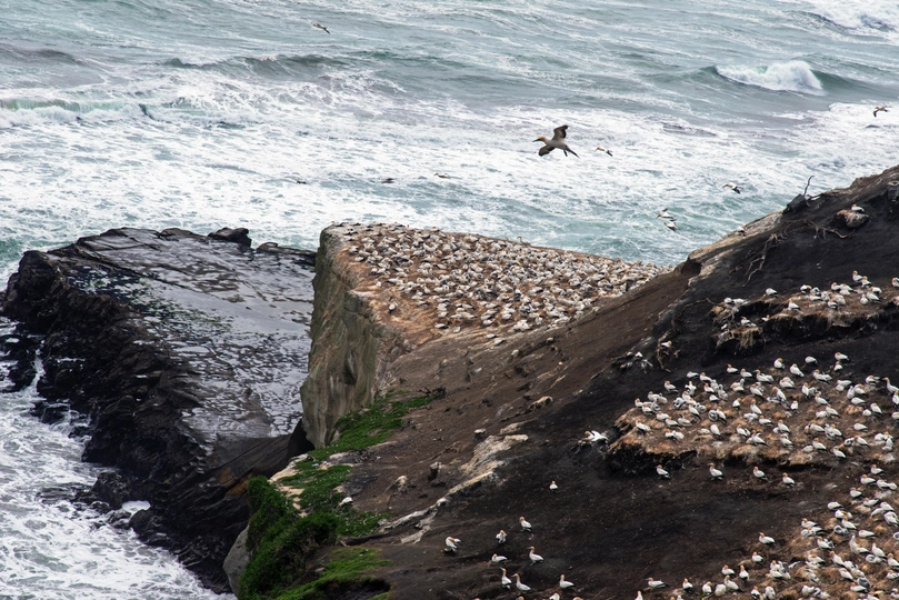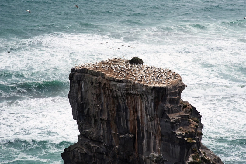精彩瞬间0098-栖息地 在新西兰奥克兰西海岸的一个叫穆里怀的地方,有一个美丽的鸟岛。鸟岛由穆里怀海滩上突兀耸立的两块巨型岩石与相邻的悬崖峭壁和周围森林组成。鸟岛是新西兰珍稀鸟类-塘鹅的主要栖息地。小塘鹅都出生在新西兰,每年的六月随家族群飞往澳洲。独特的地理环境、庞大的鸟群加上优美的海岸风光,此地被美国国家地理杂志评选为“全球必看的30大美景”