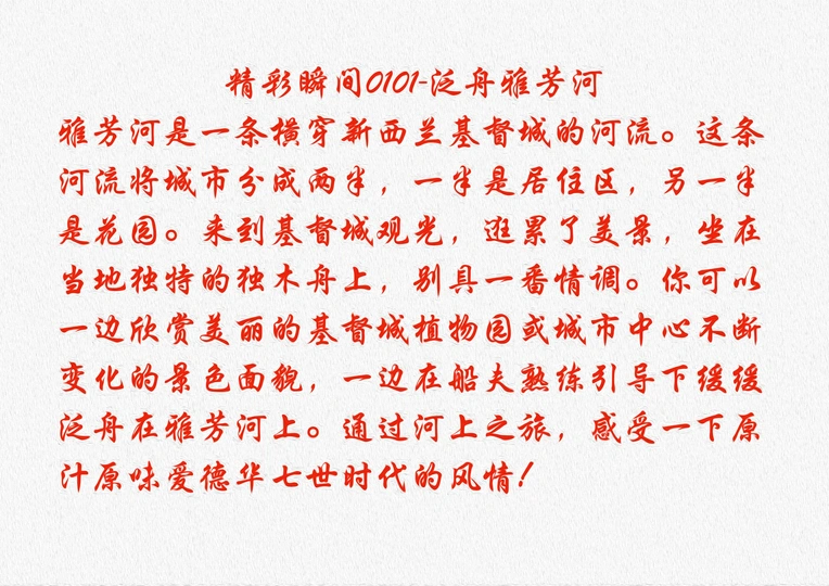 精彩瞬间0101-泛舟雅芳河 雅芳河是一条横穿新西兰基督城的河流。这条河流将城市分成两半,一半是居住区,另一半是花园。来到基督城观光,逛累了美景,坐在当地独特的独木舟上,别具一番情调。你可以一边欣赏美丽的基督城植物园或城市中心不断变化的景色面貌,一边在船夫熟练引导下缓缓泛舟在雅芳河上。通过河上之旅,感受一下原汁原味爱德华七世时代的风情!