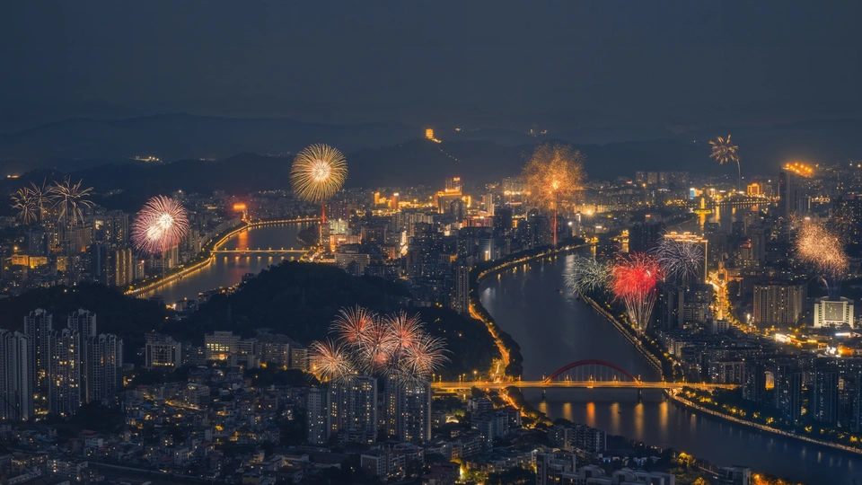 这是一幅韶关的城景通过时间合成和焦段合成的方式把多次烟花的绽放保留下来,是这座小城市最后的浪漫