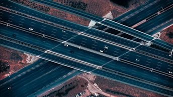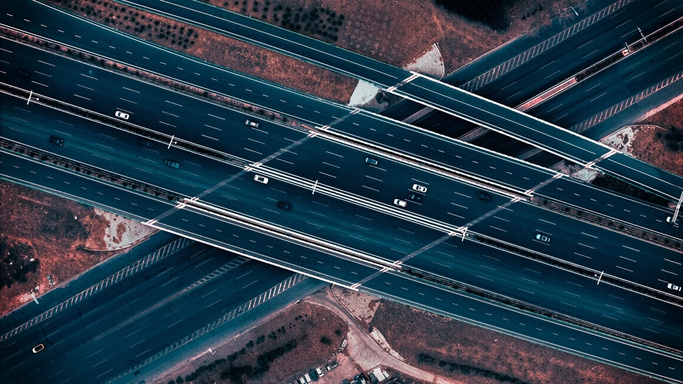 从空中俯瞰,几条公路相互交错,形成复杂的立体路网。路上行驶着几辆汽车,仿佛一个个小棋子在这庞大的交通棋盘上移动,展现出城市交通的繁忙与有序。