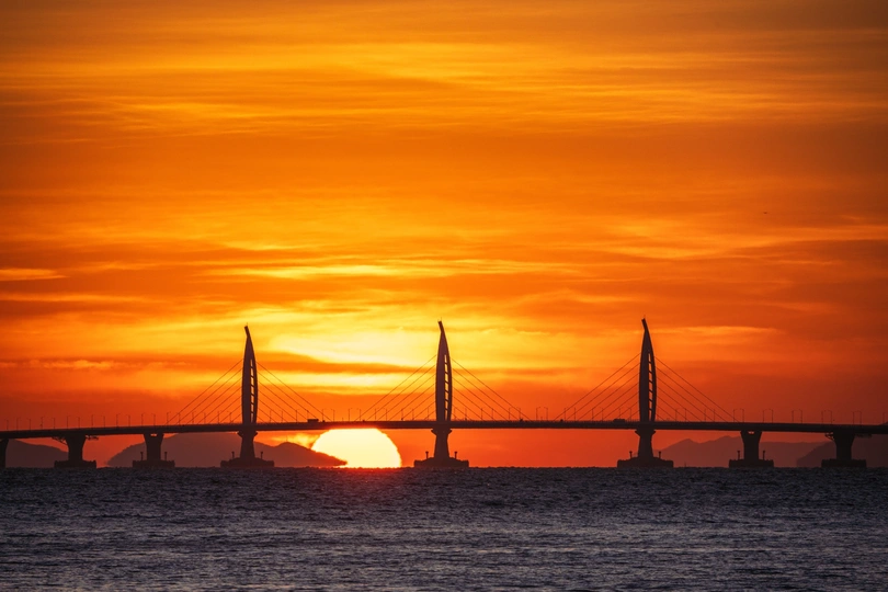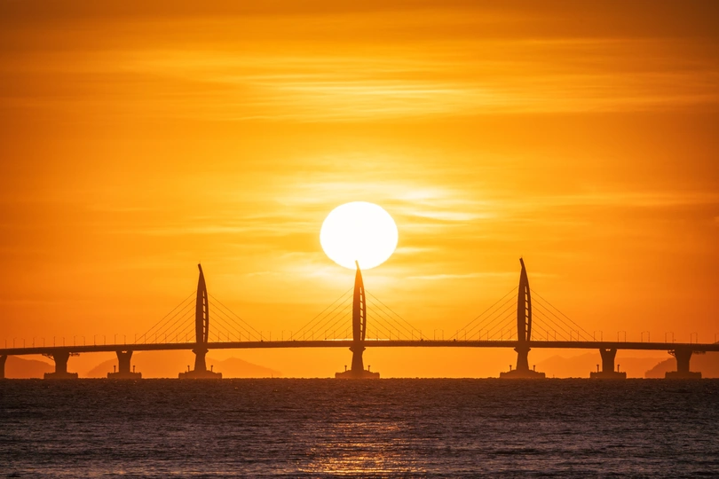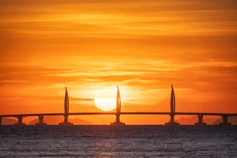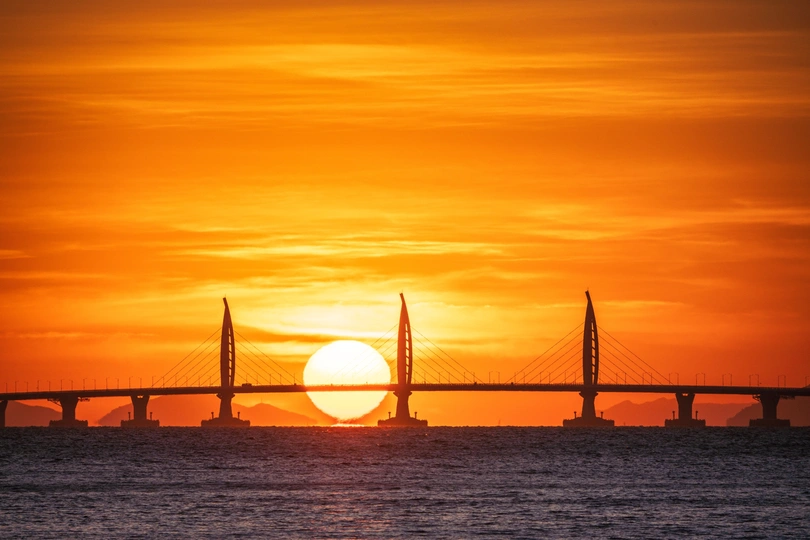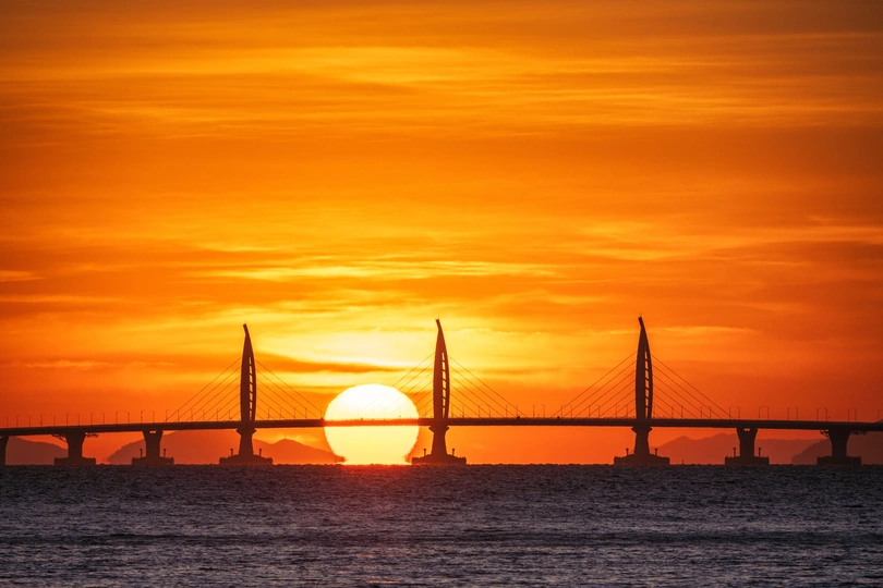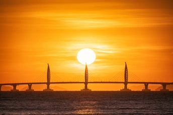 欧米伽日出与港珠澳大桥海豚塔,港珠澳大桥不仅是一项伟大的工程技术成就,更是粤港澳大湾区内各城市之间联系的象征,代表着区域合作与发展的重要里程碑。