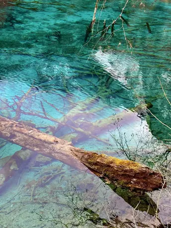 清澈湖底,枯木静卧,似在诉说岁月。水波轻漾,光影摇曳,一抹幽蓝,藏着自然的诗意与时光的温柔。